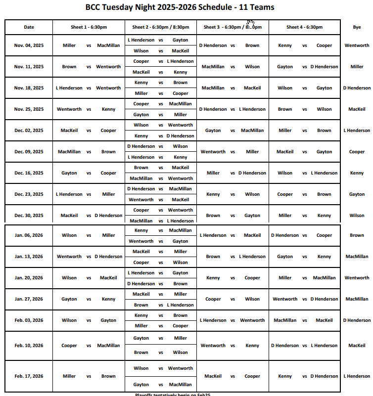 Tuesday Night League Schedule 2025/2026